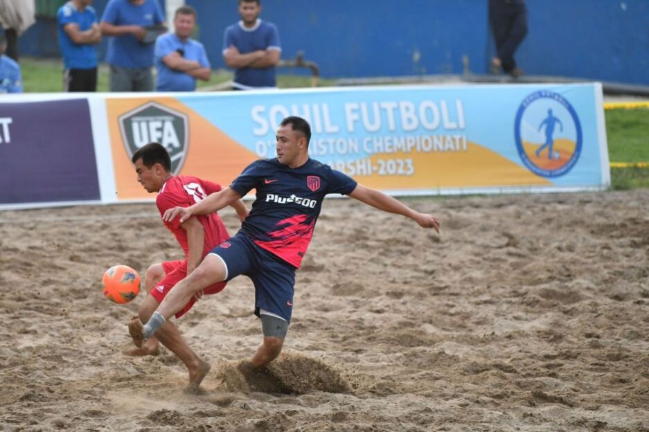 Пляж футболини ривожлантириш учун аввало ФИФА ва ОФК стандартларига жавоб берувчи қумли майдонга эга бўлишимиз талаб қилинади. Бизда адашмасам битта шундай майдон бор: Қаршидаги "Геолог" спорт мажмуаси ҳудудида жойлашган. Лекин бу майдон ҳозир қай ҳолатда, қуми яхшими, буни билмаймиз. Ўтган йил ёзда шу майдонда Ўзбекистон чемпионати ўтказилиб, 10та жамоа иштирок этди ва Бухоронинг "Oil Star" жамоаси чемпионликни қўлга киритди.