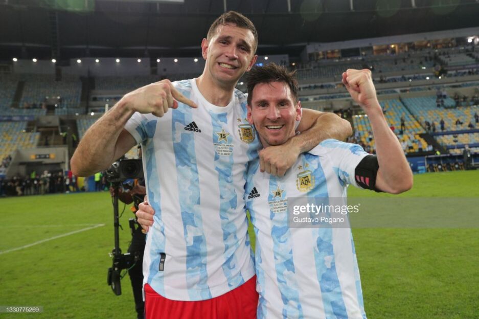 Argentina terma jamoasi hujumchisi Lionel Messi Urugvay ustidan qozonilgan g'alabadan so'ng (3:0) jamoa darvozaboni Emiliano Martinesni etirof etdi.