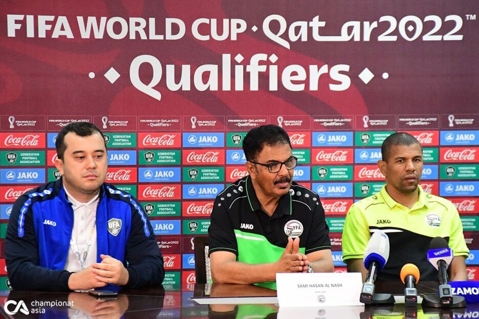 JCH-2022 saralashi doirasidagi O'zbekiston - Yaman uchrashuvidan oldingi matbuot anjumanida dastlab mehmonlar ustozi Sami Hasan Al Nash va jamoa darvozaboni Salim Avad ishtirok etishdi.
